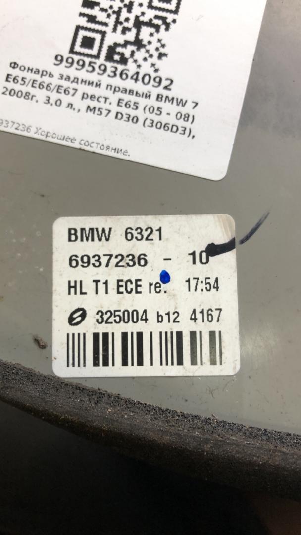 ![фонарь задний правый BMW 7 серия E65/E66/E67 [рестайлинг] E65 2008, 3.0 л., M57 D30 (306D3), дизель, АКПП, sterling-grau metallic (472), седан, задний привод, 63216937236, 6937236 - фото №4](https://st.carrobiz.com/gallery/version/491/car-part/1192198/3140031/preview.jpg)
