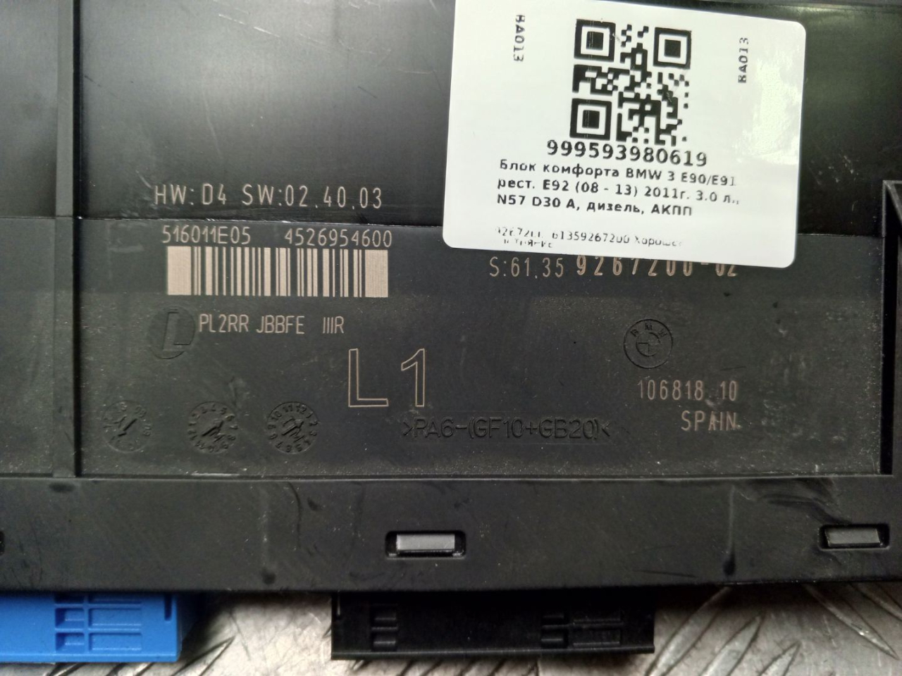 ![блок комфорта BMW 3 серия E92/E93 [рестайлинг] E92 2011, 3.0 л., N57 D30 A, дизель, АКПП, blue-water metallic (896), купе, задний привод, правый руль, 61359267200, 9267200 - фото №1](https://st.carrobiz.com/gallery/c/491/433debf6810ace7d204e9e5b27477ad5/base.jpg)